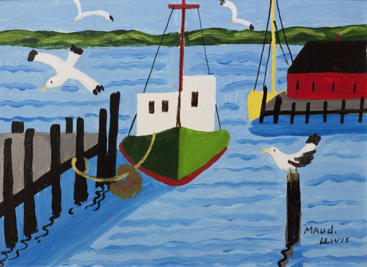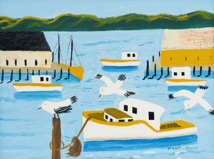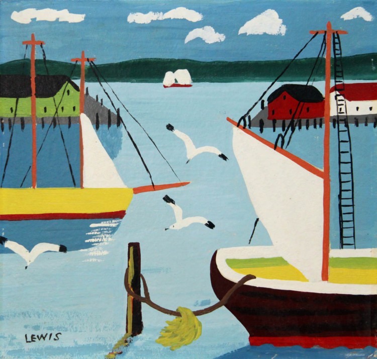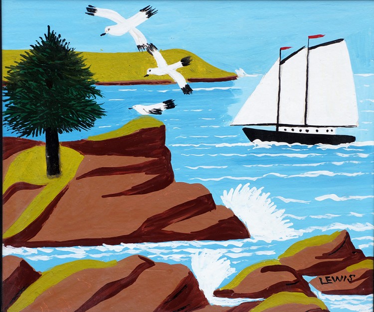 Between 1945 and 1950, people began to stop at Lewis' Marshalltown home on Highway No. 1, the main highway and tourist route in western Nova Scotia, and buy her paintings for two or three dollars. Only in the last three or four years of Lewis' life did her paintings begin to sell for seven to ten dollars. She achieved national attention as a result of an article in the Toronto-based Star Weekly in 1964, and in 1965, she was featured on CBC-TV's Telescope. Two of Lewis' paintings were ordered by the White House in the 1970s during Richard Nixon's presidency. Unfortunately, her arthritis deprived her from completing many of the orders that resulted from the national exposure. In recent years, her paintings have sold at auction for ever increasing prices. Two of her paintings have sold for more than $16,000. The highest auction price so far is $22,200.00 for lot 196 "A Family Outing". The painting was sold at a Bonham's auction in Toronto on November 30, 2009. Another painting, "A View of Sandy Cove", sold in 2012 for $20,400. A painting found in 2016, "Portrait of Eddie Barnes and Ed Murphy, Lobster Fishermen", at an Ontario thrift store sold in auction for almost three times its estimated price. The online auction ended May 19, 2017, and the painting, which was appraised at $16,000, went for $45,000.