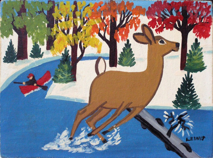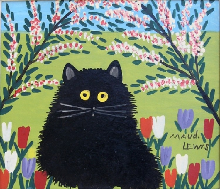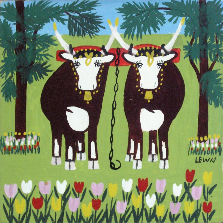 Maud Lewis used bright colours in her paintings, and subjects were often of flowers, oxen teams, horses, birds, deer, or cats. Many of her paintings are of outdoor scenes, like Cape Island boats bobbing on the water, horses pulling sleigh, skaters, portraits of dogs, cats, deer, birds, and cows. Her paintings were inspired by childhood memories of the landscape and people around Yarmouth and South Ohio as well as Digby locations such as Point Prim and Bayview. Christmas cards and calendars also provided influence. Most of her paintings are quite small - often no larger than eight by ten inches, although she is known to have done at least five paintings 24 inches by 36 inches. The size was limited by the extent she could move her arms. She used mostly wallboard and tubes of Tinsol, an oil-based paint. Lewis's technique consisted of first coating the board with white, then drawing an outline and then applying paint directly out of the tube. She never blended or mixed colours.